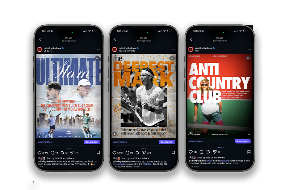The goal is to the the story of tennis in contemporary and refined way beyond the usual clichés. Each piece blends long-form storytelling and high-impact visuals, crafted to capture attention and spark curiosity. Every detail matters: from the aesthetic to the relevance of the data.